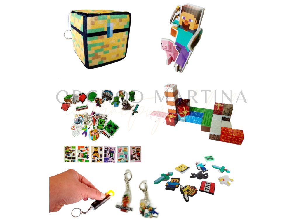 Uvnitř kalendáře najdete pestrý mix drobností – od magnetických stavebních kostek s herními texturami přes figurky, samolepky a gumové přívěsky až po tematické klíčenky a dekorace. Výraznou součástí je i měkká kostka s designem truhly, která slouží jako hrací prvek. Vše laděno v ikonickém Minecraft stylu.