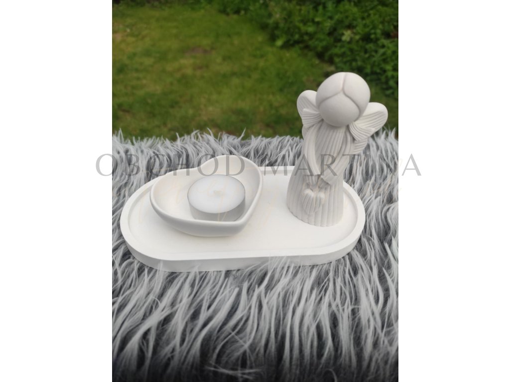 Elegantní dárkový set obsahuje ručně vyrobeného andílka z umělého kamene o výšce 10 cm, svícen ve tvaru srdíčka o rozměrech 8 × 7 cm a dekorativní tácek o velikosti 18 × 9 cm.