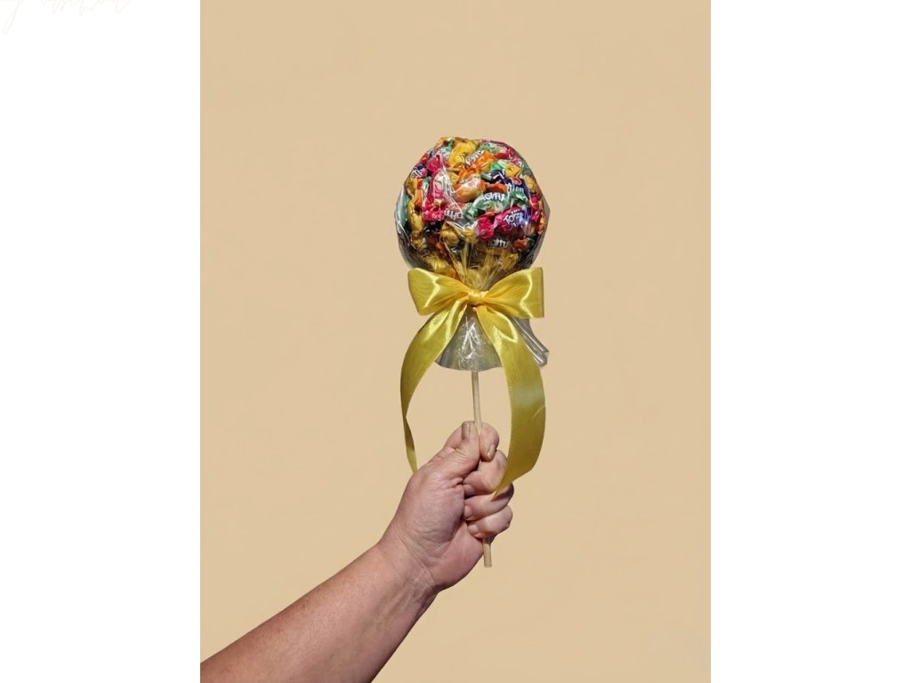 Originální dárkové bonbónové lízátko XXL je sladké překvapení, které zaujme na první pohled. Ručně vyráběné lízátko je vyskládané z oblíbených bonbónů a vytvořené do tvaru obřího lízátka. Pečlivé balení do průhledného celofánu a výrazná žlutá stuha z něj dělají ideální dárek pro každou příležitost.