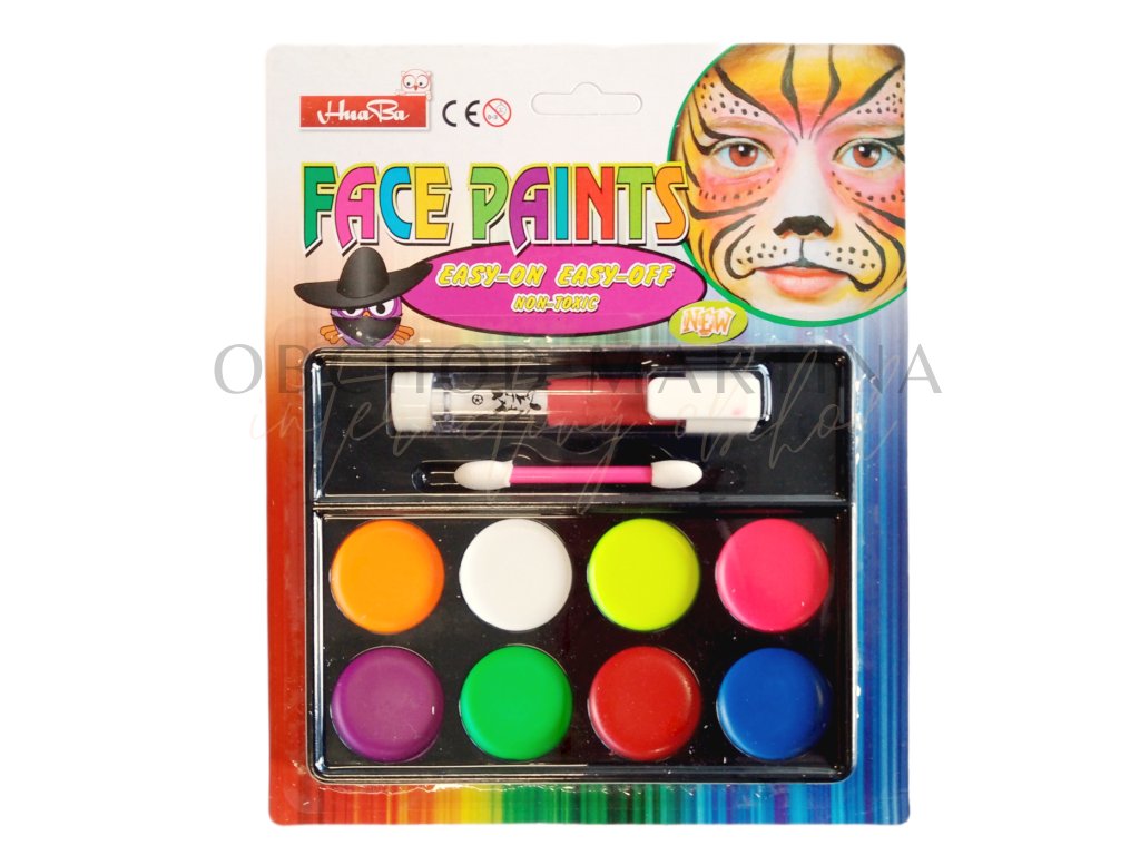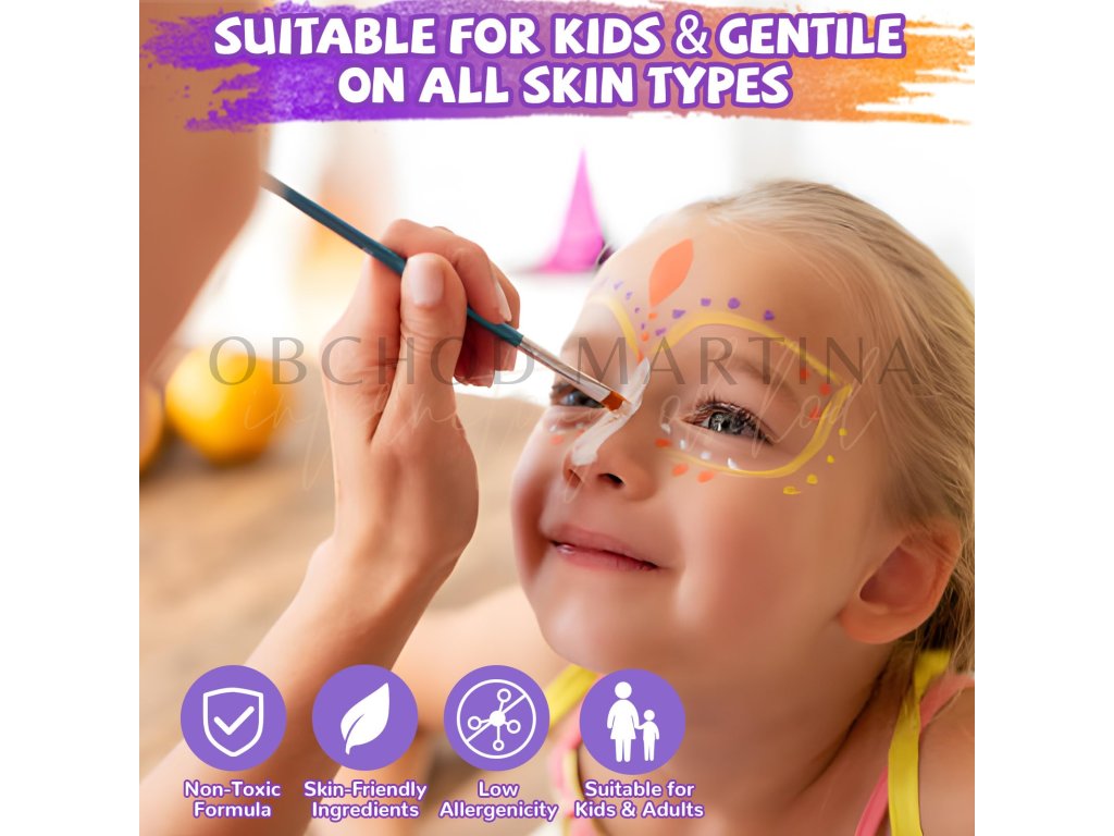 Barvy jsou dermatologicky testované, netoxické a šetrné k dětské pokožce, což zajišťuje bezpečnost i při delším nošení. Součástí balení je také tyčinka s bílým voskem a oboustranný aplikátor pro snadnou aplikaci. Díky kvalitnímu složení lze barvy snadno smýt vodou a mýdlem, bez nutnosti silného tření.