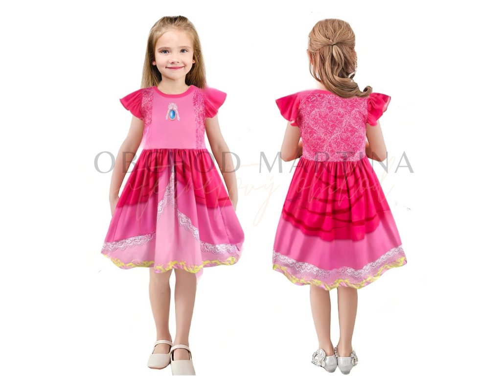 Šaty jsou navrženy v sytě růžových a fialových odstínech s potiskem krajky a ozdob, které evokují královský styl. Na hrudníku je tištěný modrý drahokam s korunkou, který celému modelu dodává kouzelný detail.