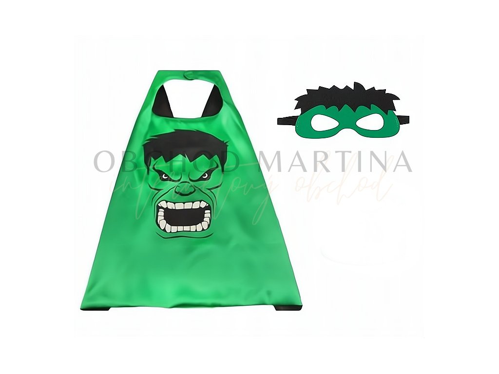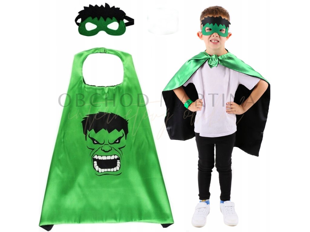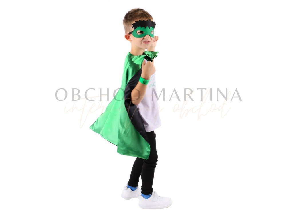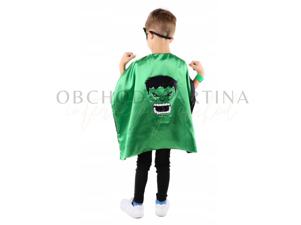 Součástí převleku je také maska s elastickou páskou, která je navržena tak, aby pohodlně seděla na hlavě a neklouzala. Maska přidává kostýmu autentičnost a umožňuje dětem úplně se vžít do role Hulka. Díky univerzální velikosti a elastickému provedení je kostým vhodný pro děti různých věkových kategorií. Plášť má vnitřní stranu černou, což dodává kostýmu zajímavý kontrast a zároveň zachovává typický „hulkovský“ zelený vzhled.