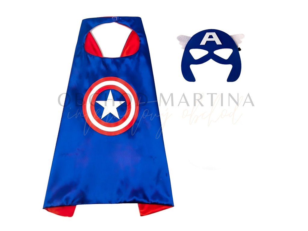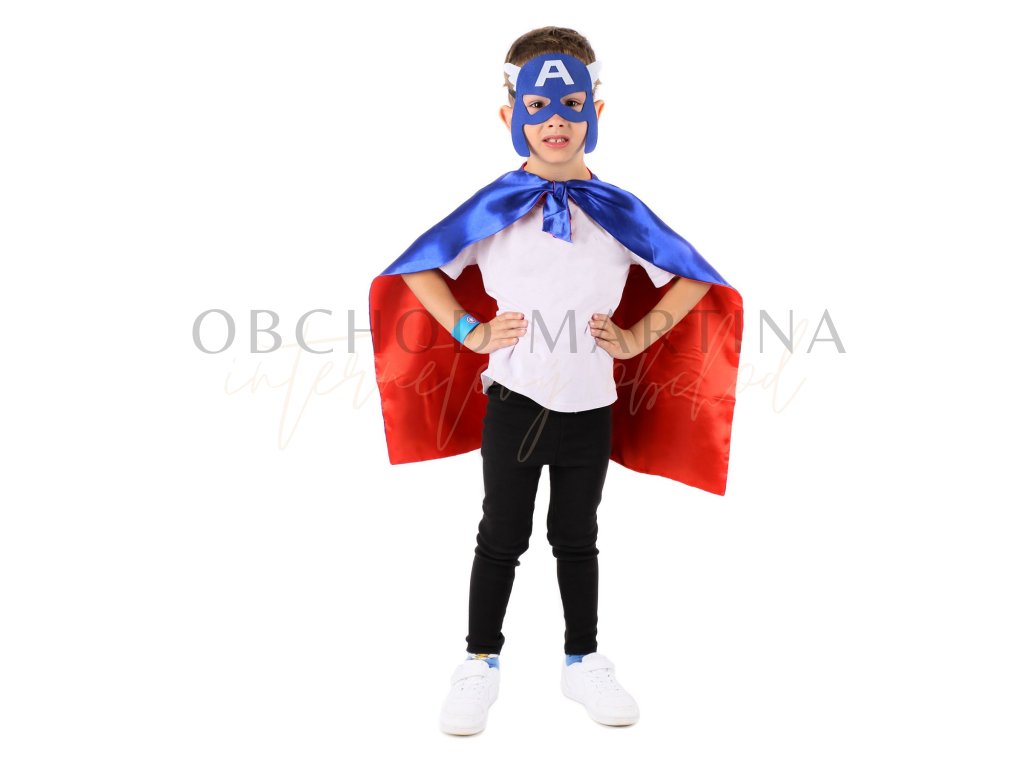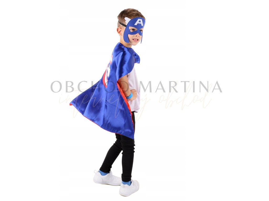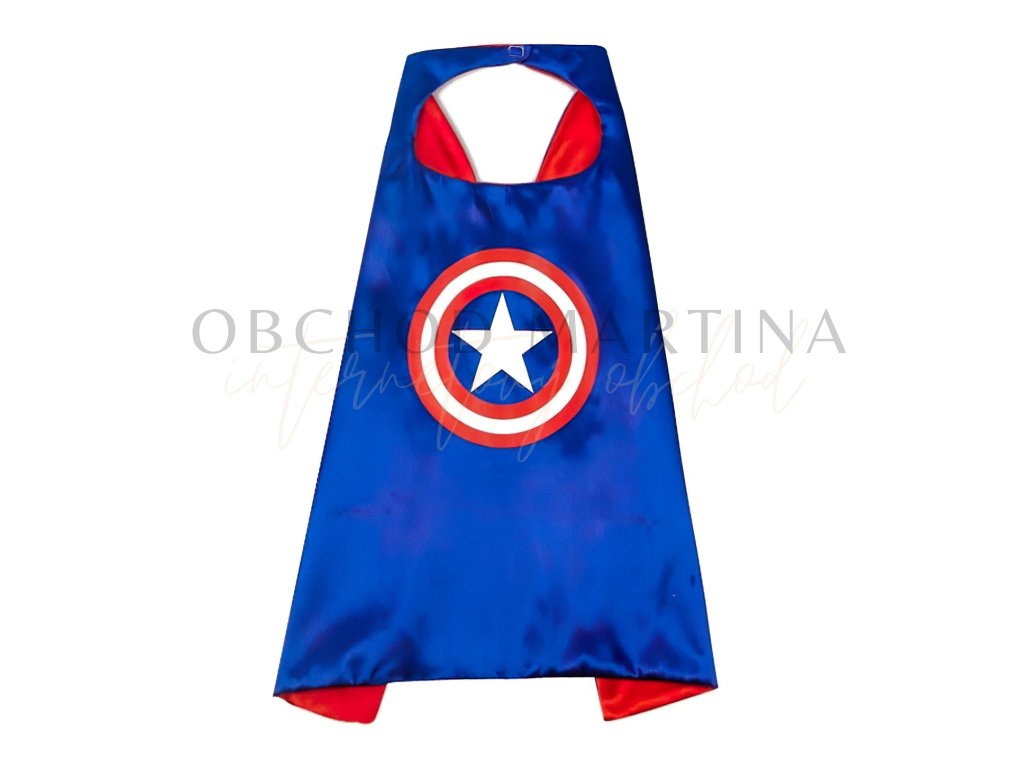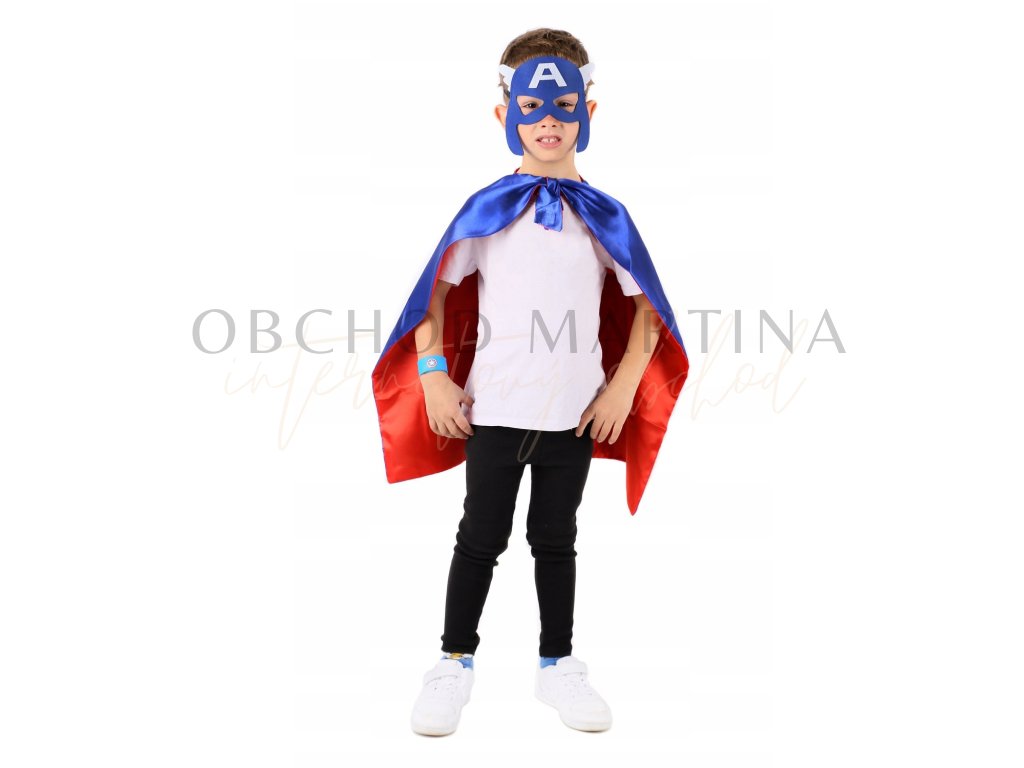Plášť je vyroben z lesklého saténu, který je příjemný na dotek a pohodlný na nošení. Jeho modro-červené provedení působí dynamicky a živě, zatímco velký motiv ikonického hvězdného štítu na zádech dává kostýmu autentický vzhled. Plášť je vybaven suchým zipem u krku, což usnadňuje jeho oblékání i svlékání, a to během pár vteřin. Saténový materiál dodává převleku zářivý lesk, který přitáhne pozornost a zároveň zajišťuje, že se dítě bude cítit pohodlně i při dlouhodobém nošení.