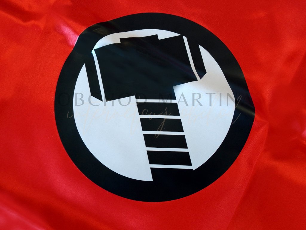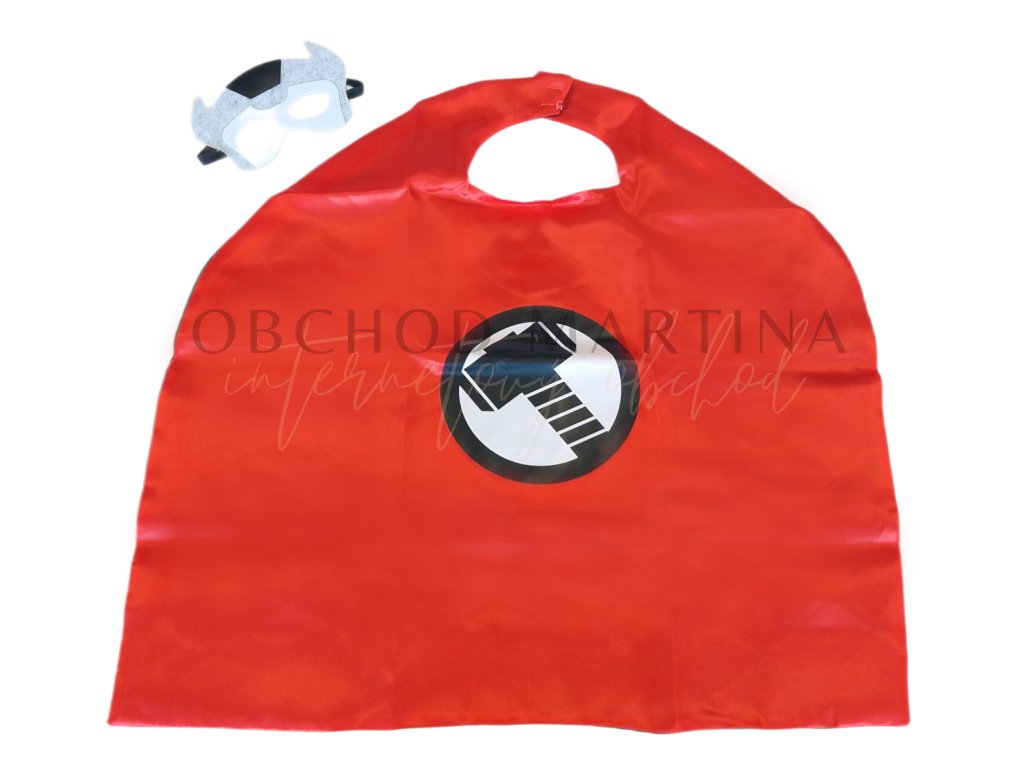 Součástí setu je červený plášť s černobílým potiskem Thorova kladiva, které je symbolem moci a spravedlnosti. Doplňuje ho originální maska z plsti s rohy a typickým motivem Thora, která skvěle padne a drží pomocí pružné gumičky.