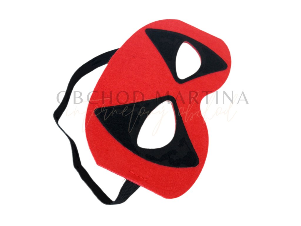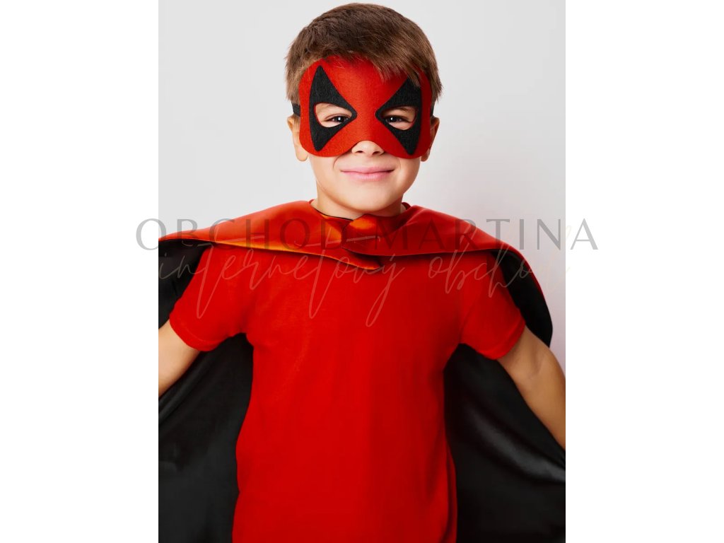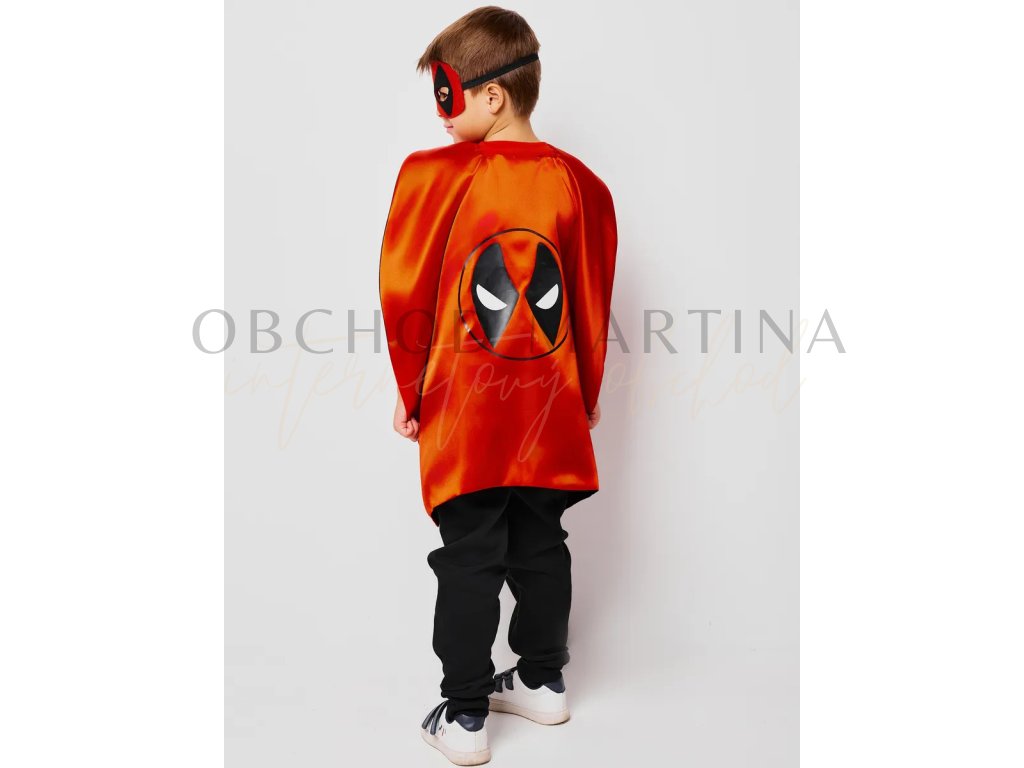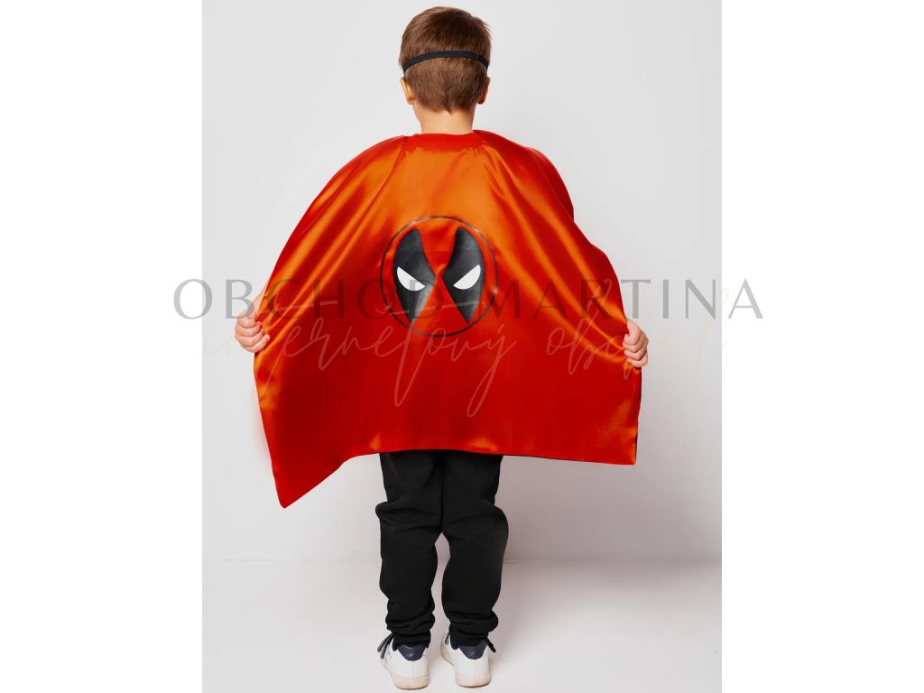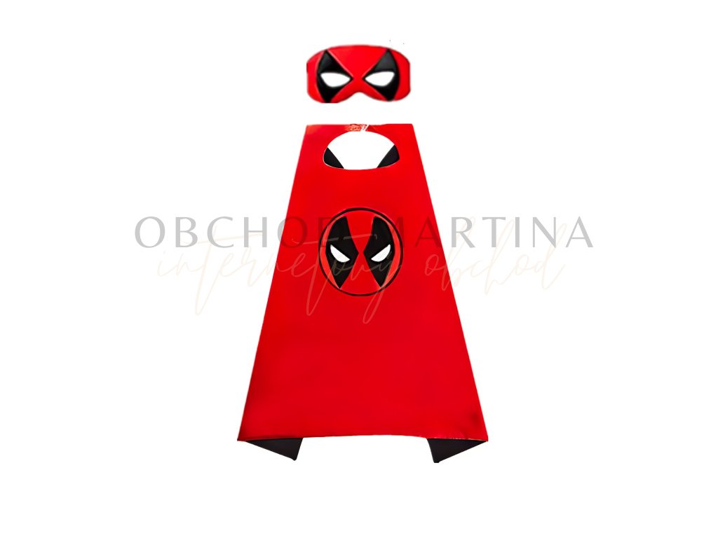 Součástí setu je červený plášť s černým potiskem ikonické Deadpoolovy masky a černá plstěná maska na gumičku pro snadné nošení. Díky jednoduchému zapínání za krkem na suchý zip se plášť pohodlně obléká a skvěle drží i během akčnějších her.