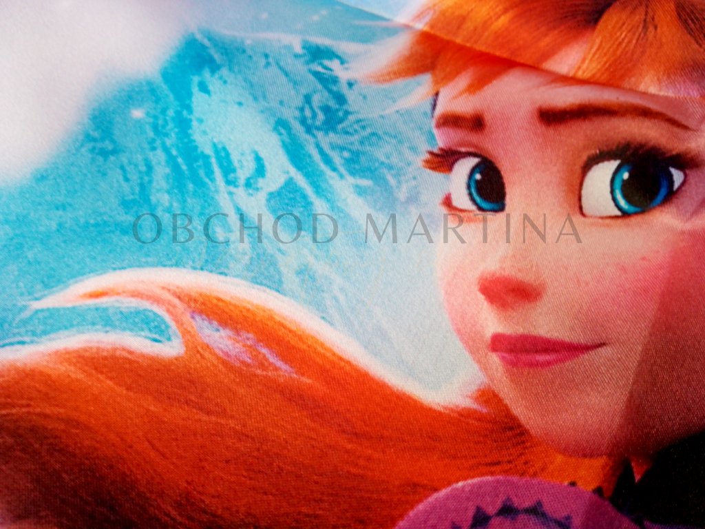 Plášť zdobí detailní potisk s oblíbenými postavami – Elsou, Annou, Kristoffem a veselým sněhulákem Olafem, takže se dítě může snadno přenést do pohádkového světa Arendelle. Součástí sady je také maska s motivem Elsy, která dotváří kouzelný vzhled.