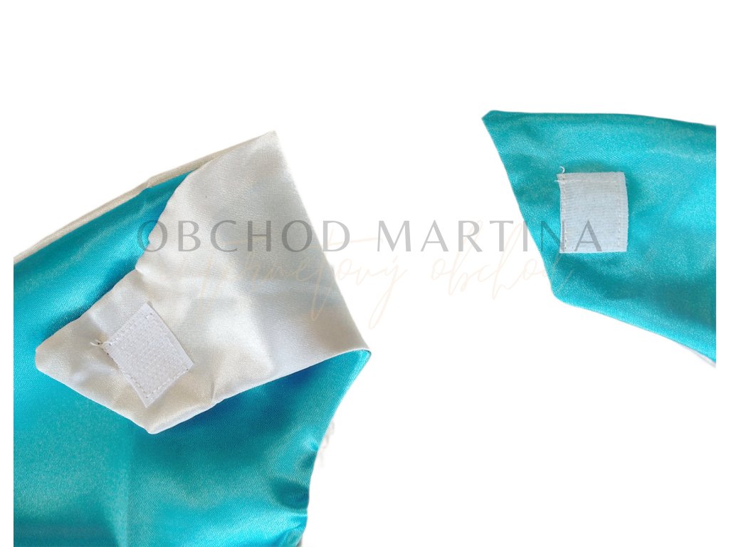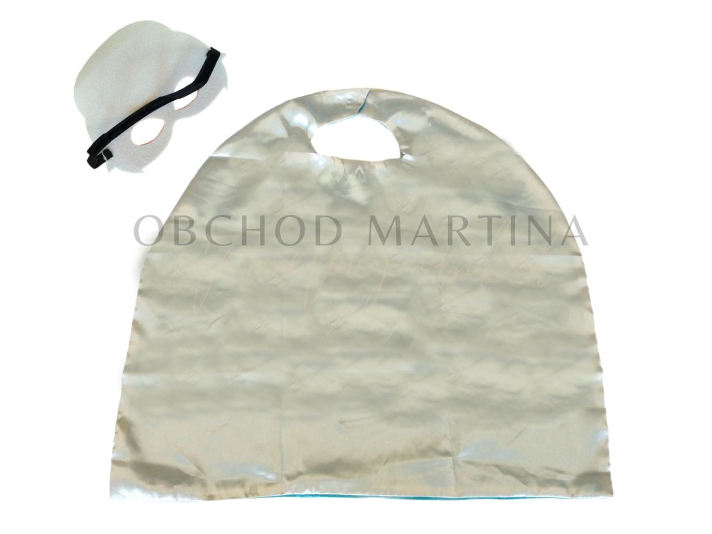 Plášť je vyroben z lehkého a lesklého polyesteru, který je měkký, prodyšný a pohodlný na nošení. Zapíná se za krkem pomocí suchého zipu, takže se snadno obléká i svléká. Maska je z plsti a má pružnou gumičku, která dobře drží bez nepříjemného tlačení.