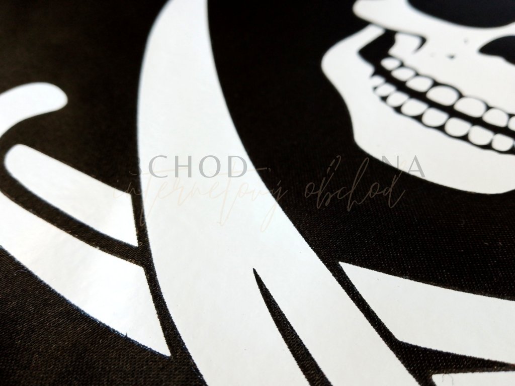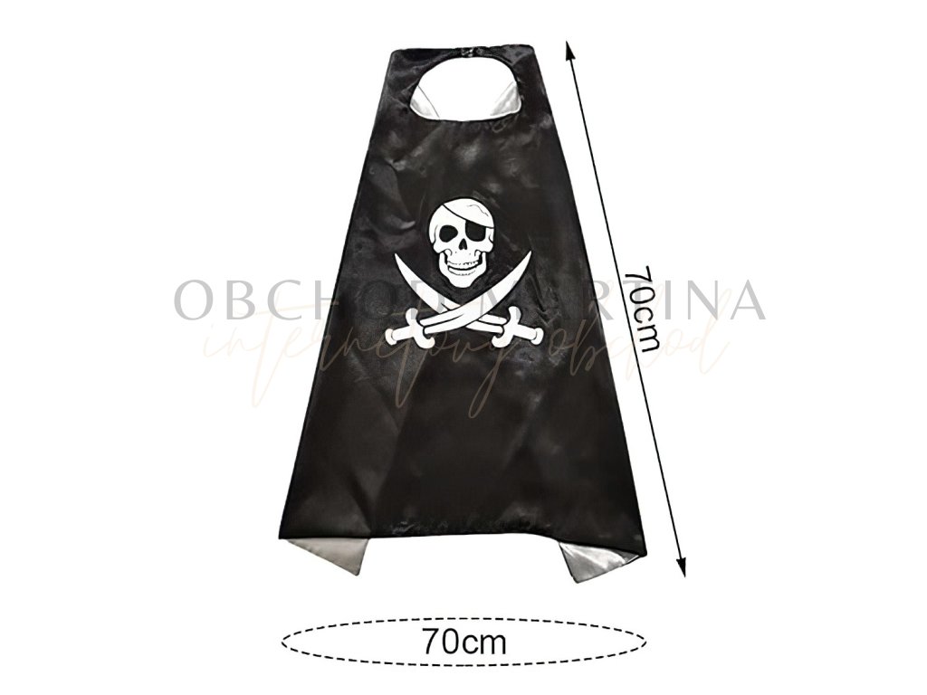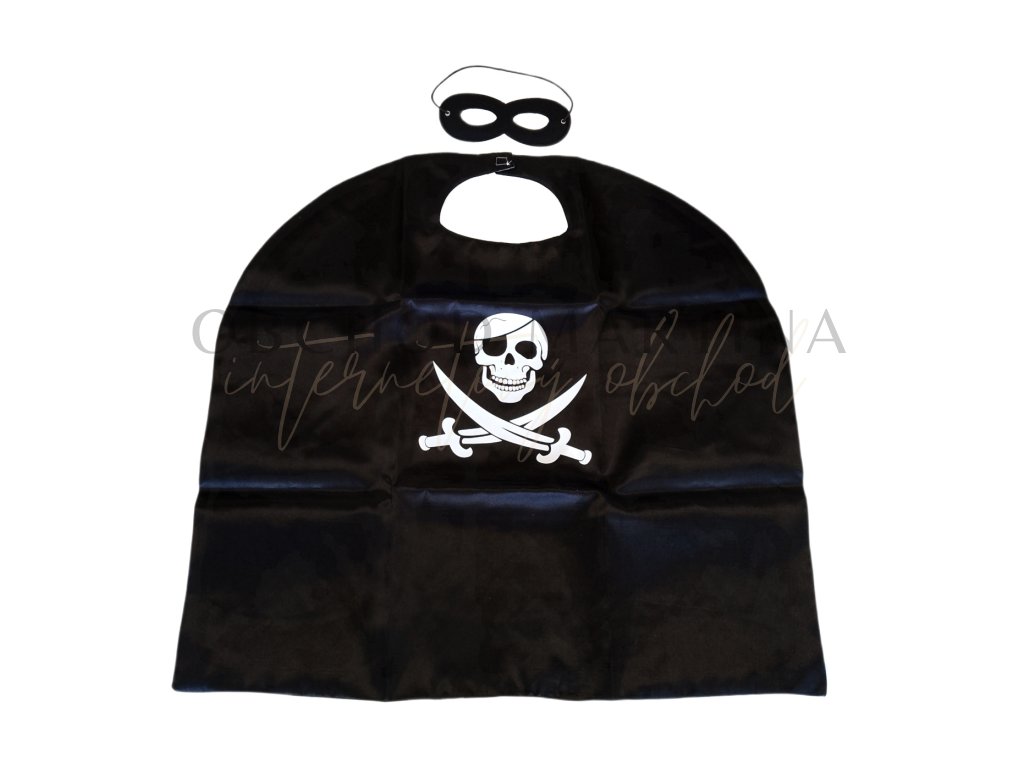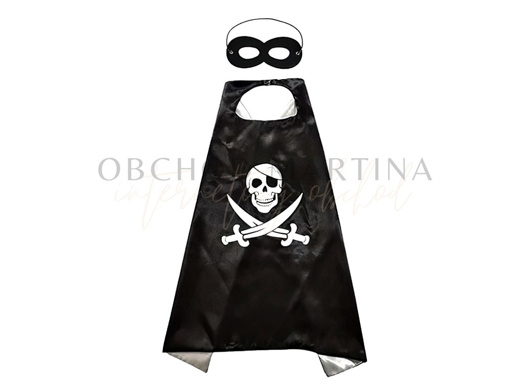 Sada zahrnuje černý plášť s klasickým pirártským symbolem lebky a zkřížených mečů a černou masku na oči pro autentický pirártský vzhled.