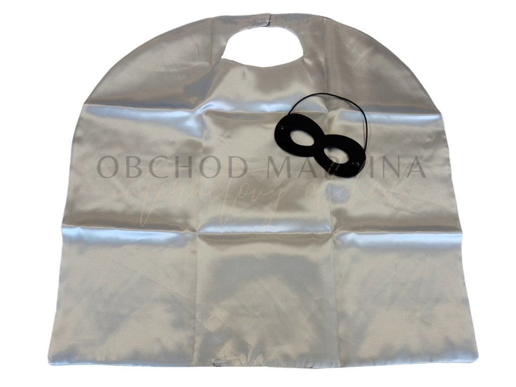 Plášť je vyroben z lehkého a hladkého saténového materiálu, příjemného na nošení, a při pohybu krásně vlaje. Je oboustranný s vnitřní stříbrnou stranou a zapínáním na suchý zip za krkem, což umožňuje snadné oblékání. Maska je z měkkého materiálu s pružnou gumičkou, která dobře drží na hlavě a neškrtí.