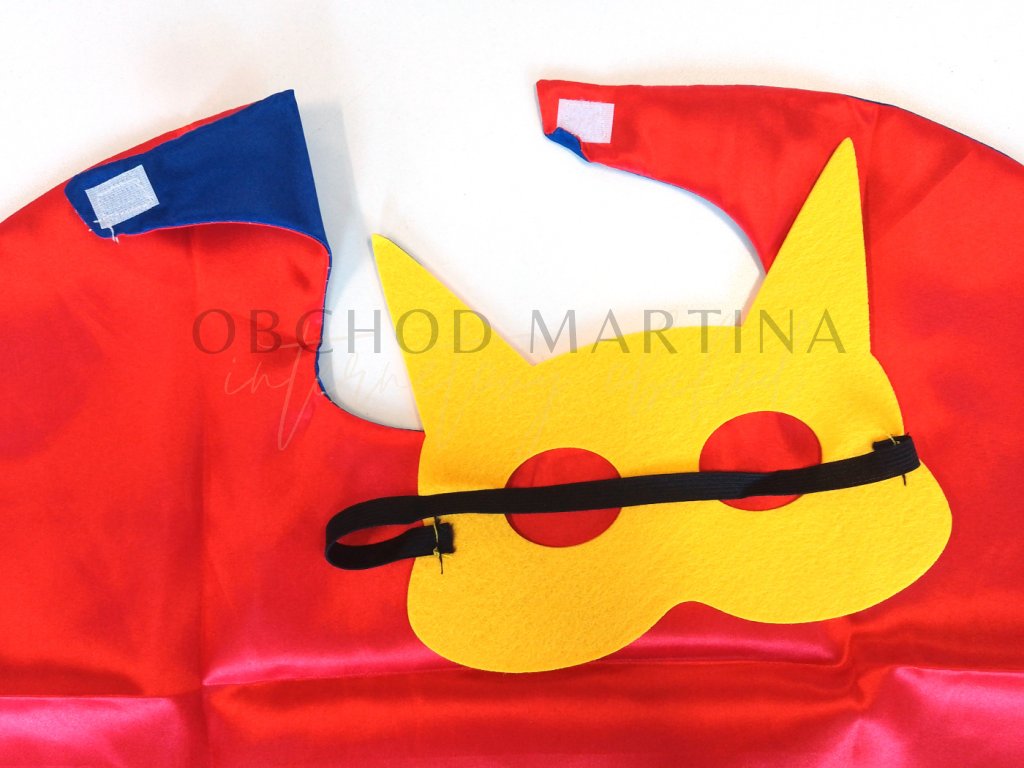 Plášť je vyroben z lesklého, lehkého saténu, který je měkký na dotek a zároveň odolný vůči běžnému opotřebení. Vnitřní strana pláště je červená, což vytváří atraktivní barevný kontrast při pohybu. Zapínání na suchý zip zajišťuje jednoduché a rychlé oblékání bez potřeby asistence dospělých.