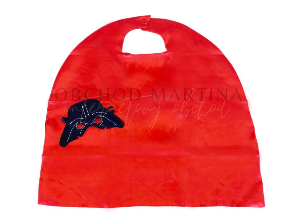 Součástí balení je černý plášť s výrazným bílým potiskem Darth Vaderovy helmy a ladící maska na obličej. Plášť má z vnitřní strany červenou podšívku, která dodává kostýmu kontrastní efekt a působivý vzhled. Zapínání za krkem je na suchý zip, takže se snadno obléká i svléká.