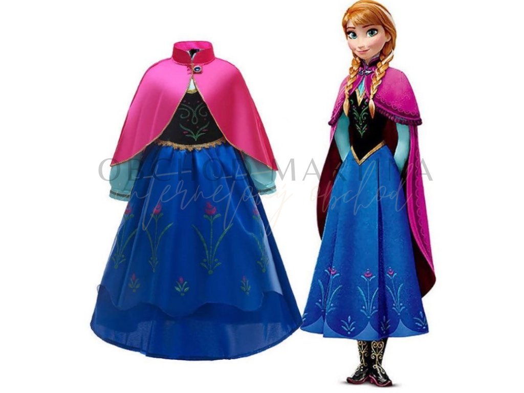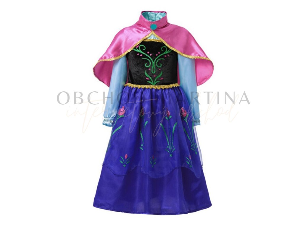 Dětský karnevalový kostým Anna Frozen, jedné z hlavních hrdinek Ledového království. Sukně kostýmu je v krásných pestrých barvách s vyšívanými motivy. Doplňkem šatů je jemná pelerína se zapínáním u krku. Modrá lesklá sukně je v pase nařasená do gumičky s ozdobným zlatým lemem. Dlouhé rukávy jsou hladké a lehké - dotvoří celkový vzhled a zaručí půvab každé malé princezny. Zažijte magii s kouzelným dětským karnevalovým kostýmem Anny z filmu Ledové království.