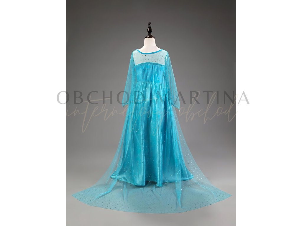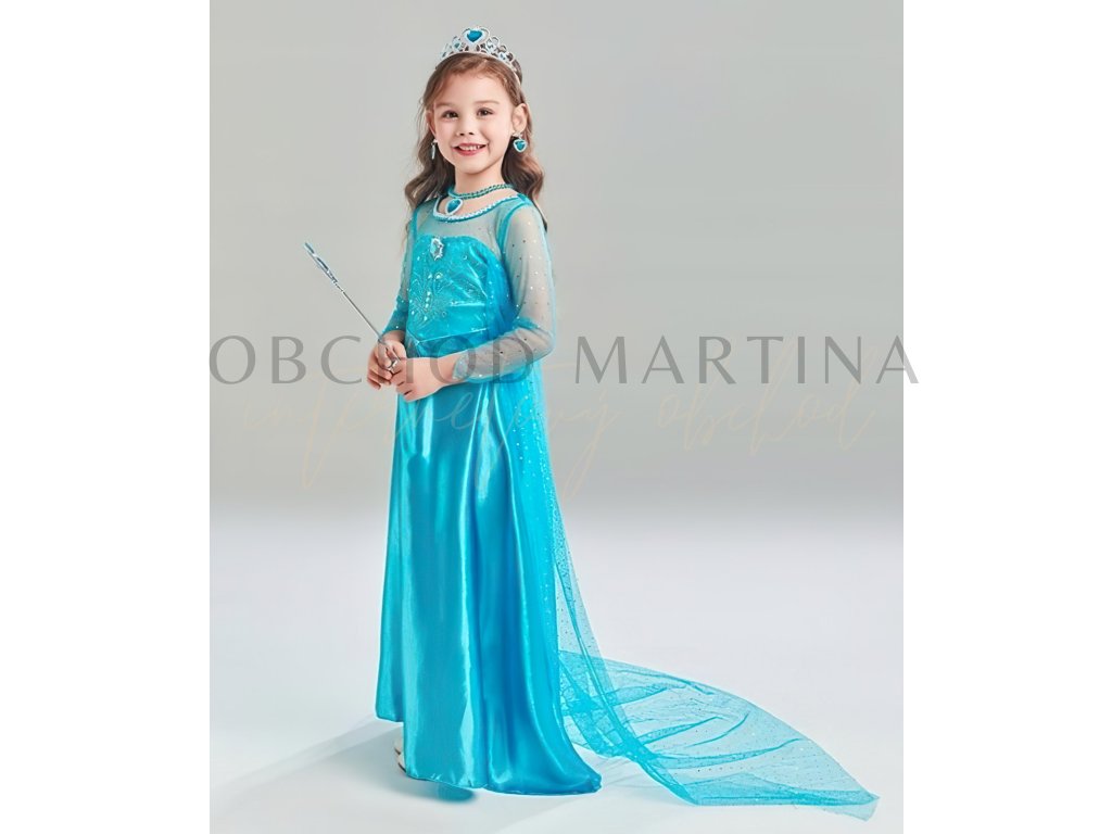 Kostým zahrnuje nádherné saténové šaty v tyrkysových modrých tónech, které září a připomínají ledové království. Šaty jsou zdobeny jemnými detaily, jako jsou flitry a kamínky nebo brož na prsou, které přidávají na eleganci. V pase je všitá pružná gumička, aby byly šaty pohodlné a dobře padly každé postavě. Dlouhé rukávy jsou vyrobeny z průhledné látky, což dodává šatům vzdušný a lehký vzhled.