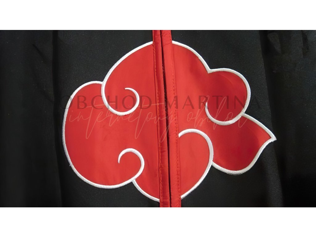 Na plášti jsou výrazné červené mraky, typické pro Akatsuki, které jsou pečlivě vyšívané a dodávají plášti autentický vzhled. Tyto výšivky jsou umístěny na několika místech, což zajišťuje, že plášť vypadá stejně dobře z různých úhlů pohledu. Červené mraky jsou symbolem Akatsuki a jejich výrazná barva kontrastuje s černou látkou pláště.