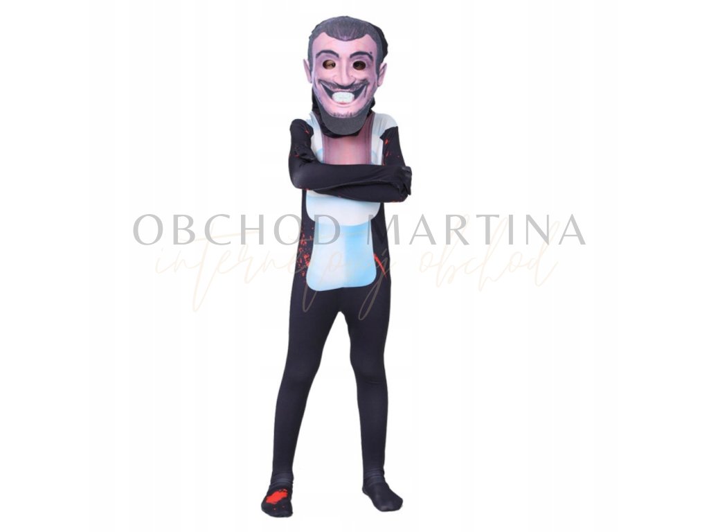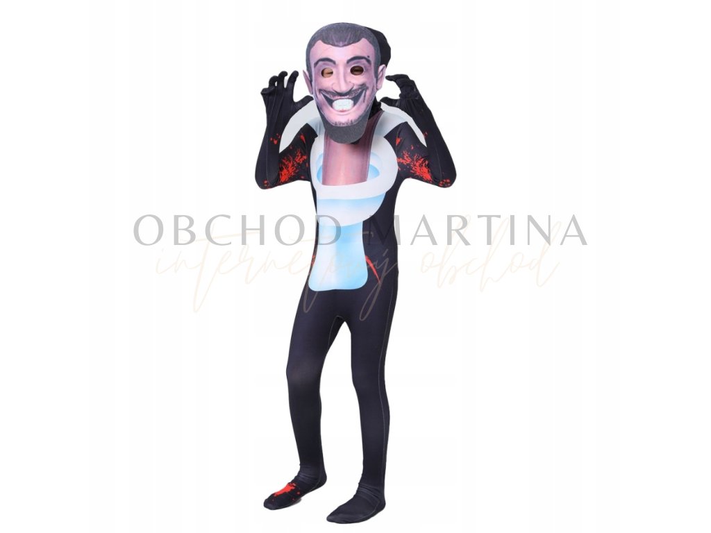 Kostým se skládá z přiléhavé kombinézy s dlouhými rukávy a nohavicemi, která je zdobena výrazným grafickým potiskem. Přiléhavý střih zajišťuje maximální pohodlí a volnost pohybu, takže děti mohou v tomto kostýmu snadno běhat, tancovat či hrát. Hlavní částí kostýmu je ikonická maska s širokým úsměvem, která dokonale odráží vzhled postavy ze Skibidi Toilet. Maska je lehká a snadno se nosí, takže je pro děti pohodlná i při delším používání.