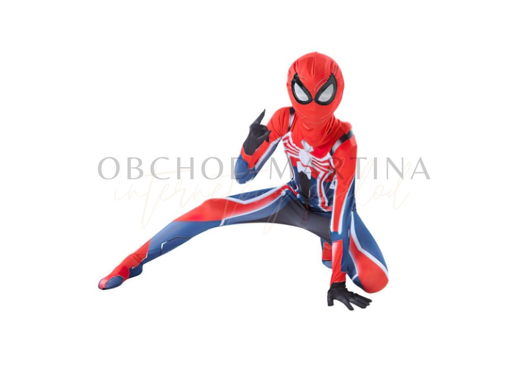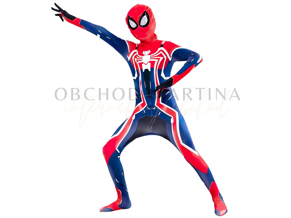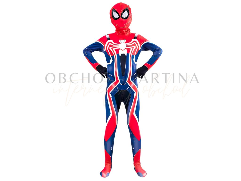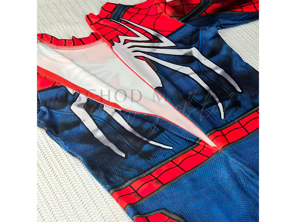 Kostým se skládá z celotělového elastického overalu s moderním designem, který kombinuje klasické červené a modré barvy s bílým pavoukem na hrudi. Součástí je také maska s velkými černými očima, která dokonale doplňuje autentický vzhled.