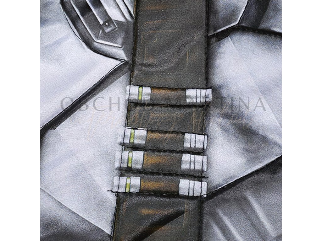 Kostým je vyroben z vysoce kvalitní potištěné lesklé pružné látky, která se dokonale přizpůsobí vaší postavě. Látka je nejen esteticky přitažlivá, ale také velmi pohodlná na nošení. Vyztužený hrudník a ramena dodávají kostýmu realistický vzhled a zároveň poskytují podporu a komfort. Detailní potisk výzbroje na těle přidává na autentičnosti a zaručuje, že se budete cítit jako skutečný Mandalorian. Zip na zadní straně kostýmu je doplněn šňůrkou, která zabraňuje nechtěnému rozepnutí, což zajišťuje, že kostým bude pevně držet na svém místě.