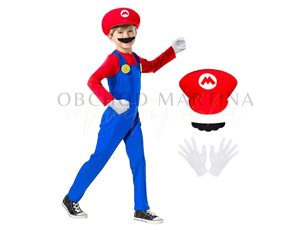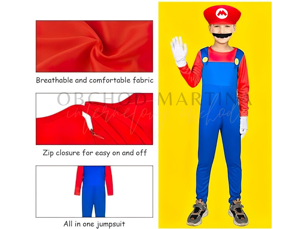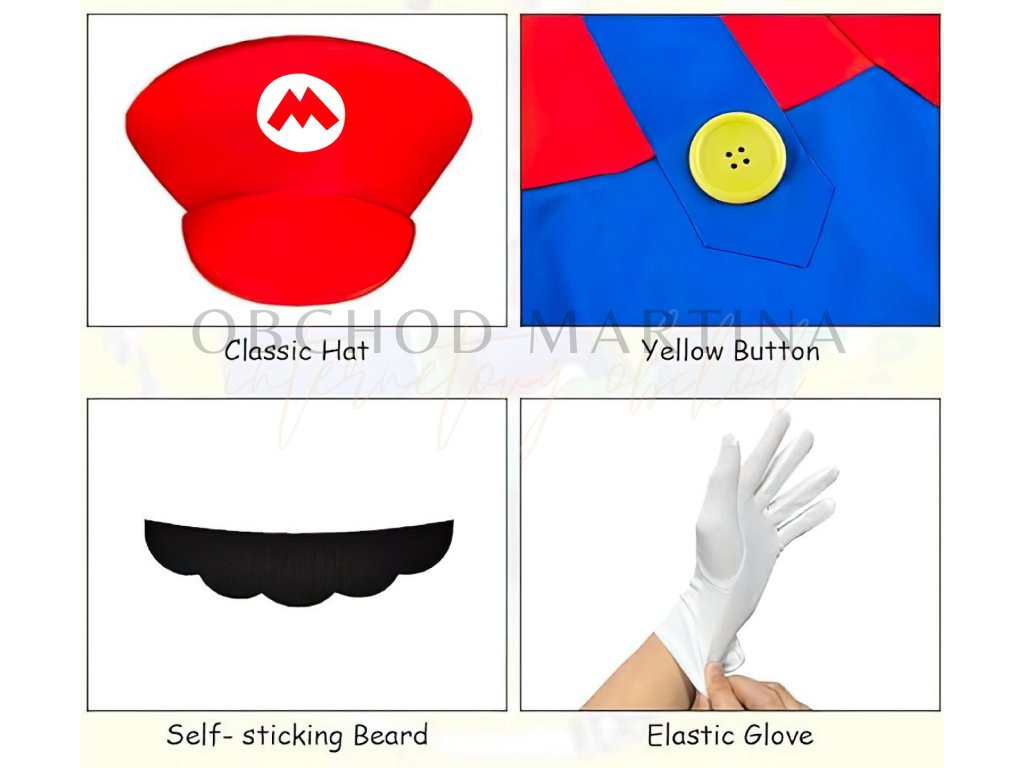 Tento kostým přináší perfektní kombinaci barev a detailů, díky kterým se vaše dítě promění v opravdového Maria. Skládá se z overalu s designem modrých kalhot s kšandami se žlutými knoflíky a červeného trička, červené čepice s charakteristickým „M“, bílých rukavic a černého nalepovacího knírku, které společně tvoří kompletní a autentický vzhled.