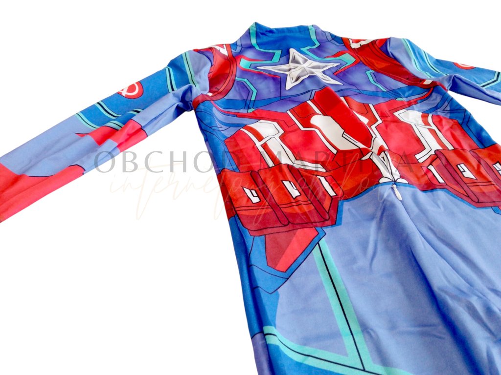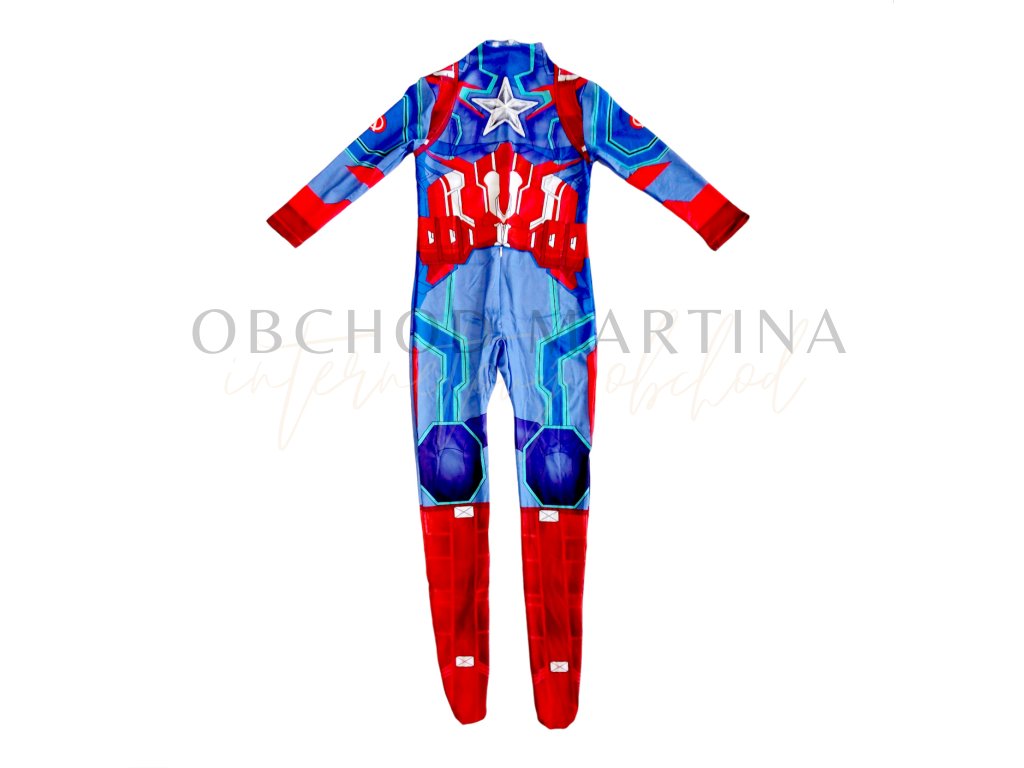 Kostým se skládá z celotělového overalu s realistickým potiskem ikonického obleku, který obsahuje hvězdu na hrudi, červené a bílé pruhy a modré detaily. Součástí je také plastová maska s písmenem "A", která dodává kompletní vzhled statečného Avengera.