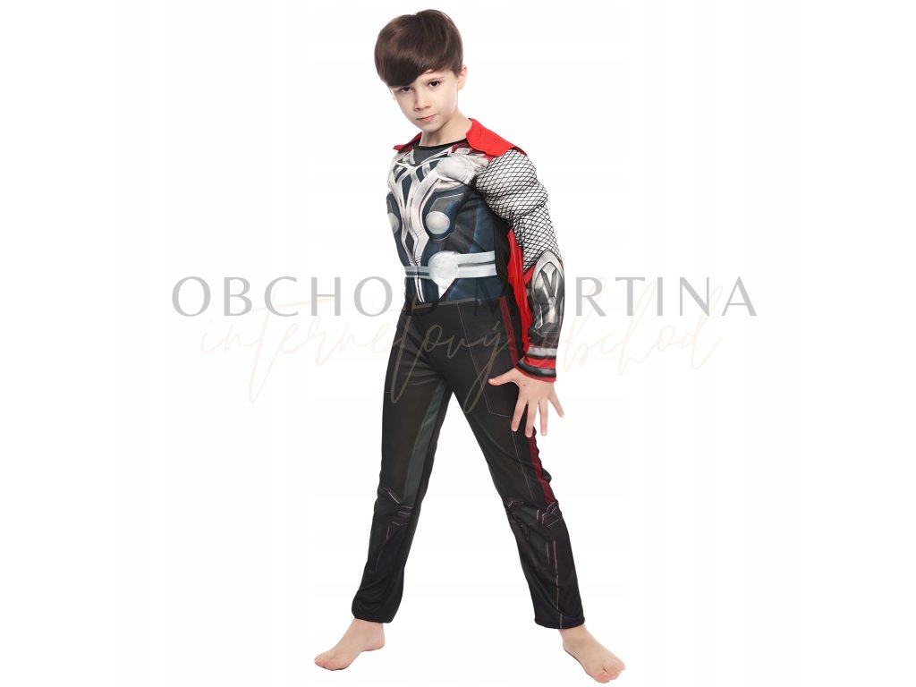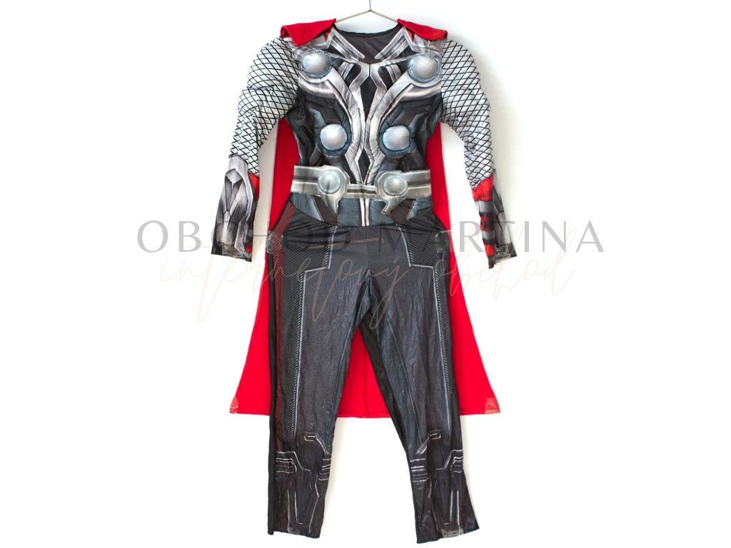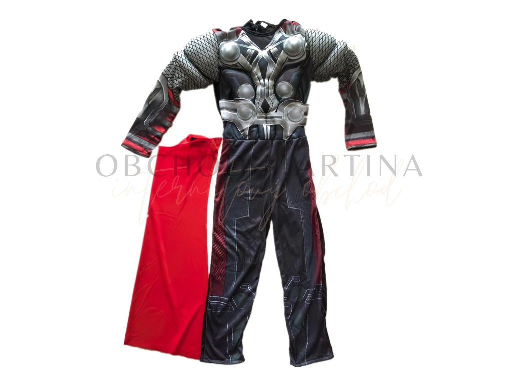 Kostým se vyznačuje autentickým vzhledem, který věrně napodobuje ikonický oblek Thora, jak ho známe z filmů a komiksů. Součástí kostýmu je černý overal s detailním potiskem, který simuluje Thorovu brnění a jeho slavný červený plášť, který dotváří celkový vzhled mocného bojovníka. Overal má pružnou gumičku v pase, aby byl pohodlný pro různé typy postav. Zapínání je řešeno zipem v zadní části a elastickýma šňůrkama za krkem. Hrudní část a ramena jsou vyplněna pro reálný dojem svalů a tam kostým působí 3D dojmem a skvěle padne. Plášť se jednoduše přichytí kolem krku pomocí suchého zipu.
