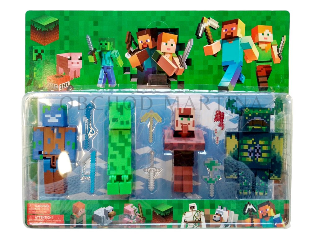 - 4x figurka - Warden, vesničan, Creeper, zombie, 6x zbraň