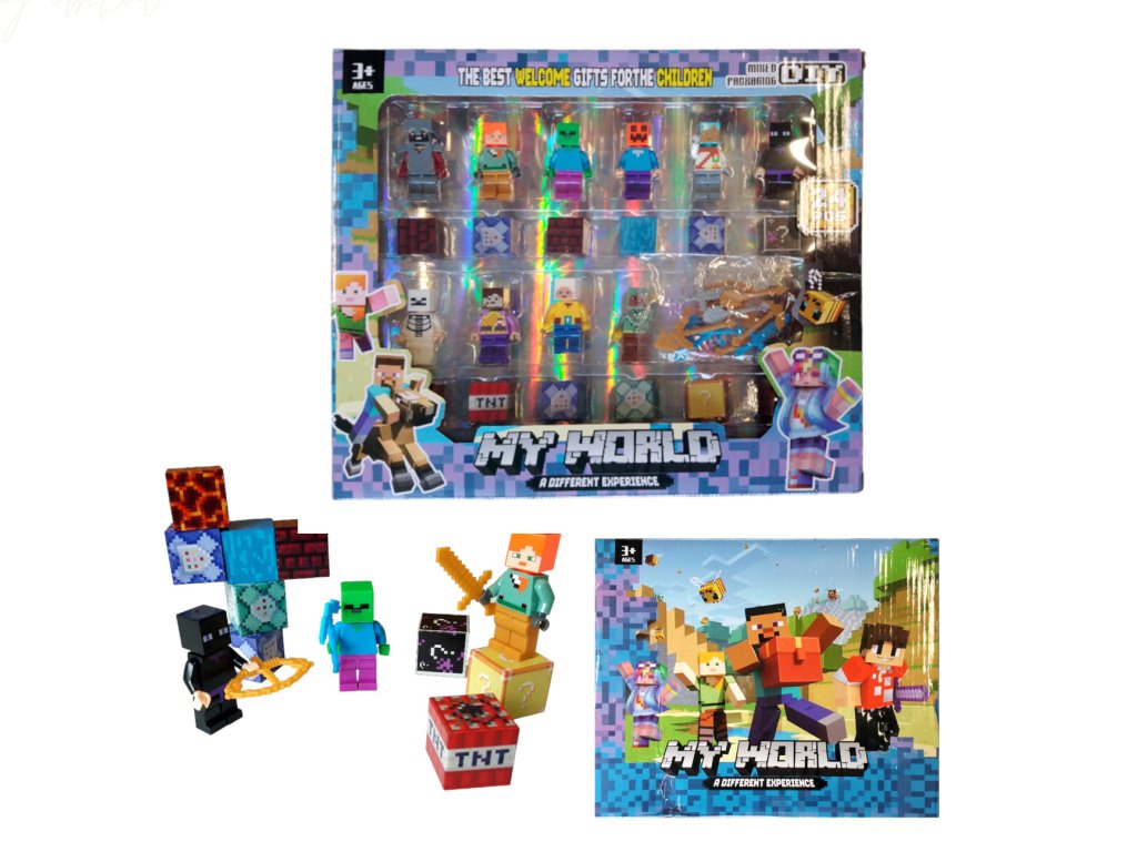 Figurky věrně napodobují známé charaktery ze hry Minecraft – od hráčů, zombie, kostlivců až po endermana nebo creepera. Nechybí ani tematické bloky jako TNT, tráva, dřevo či láva, které znásobují možnosti kreativní hry.