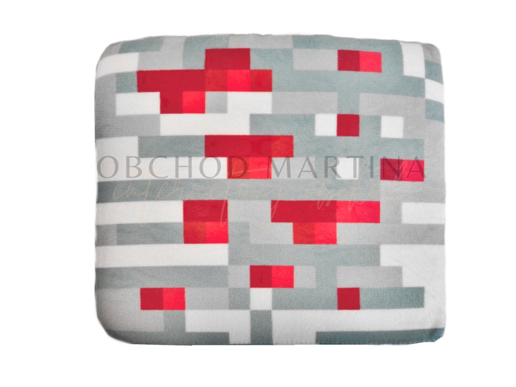 Design věrně kopíruje vzhled redstone rudy, s typickým šedým podkladem a jasně červenými pixelovými skvrnami, které znázorňují rudné prvky. Redstone je jeden z nejdůležitějších a nejzajímavějších prvků v Minecraftu. Funguje jako elektrické vedení a slouží k přenášení signálů, které mohou ovládat různé bloky a mechanismy.