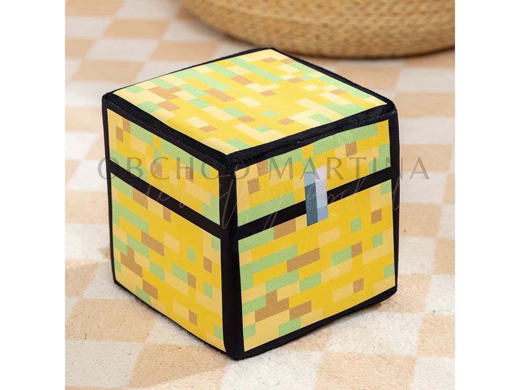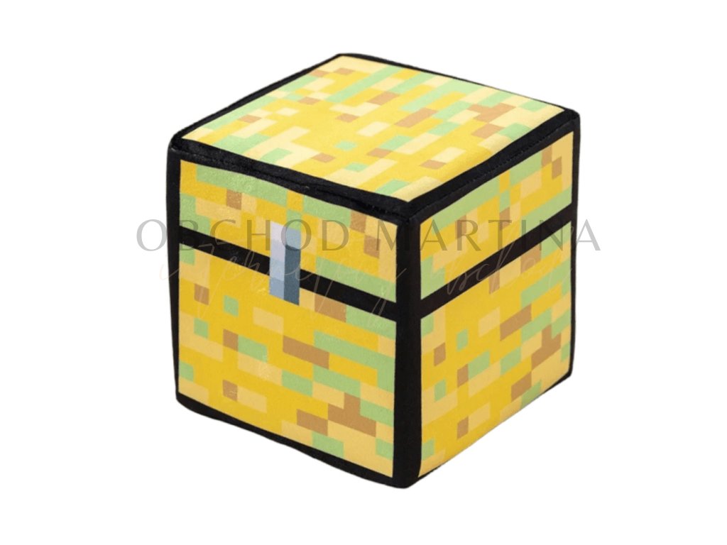 Se svým pixelovým vzhledem, sytě žlutými a zlatavými odstíny a černým lemováním věrně napodobuje vzhled herního úložiště pokladů a surovin. Truhla je základní úložný blok v Minecraftu, který slouží k ukládání a organizaci předmětů. Bez ní by hráč neměl kde skladovat materiál jako suroviny, nástroje, jídlo a další cennosti. Truhla je velmi důležitý blok pro správu zásob. Ať už jsi nováček nebo zkušený stavitel, truhla ti bude věrným parťákem od začátku až do endu.