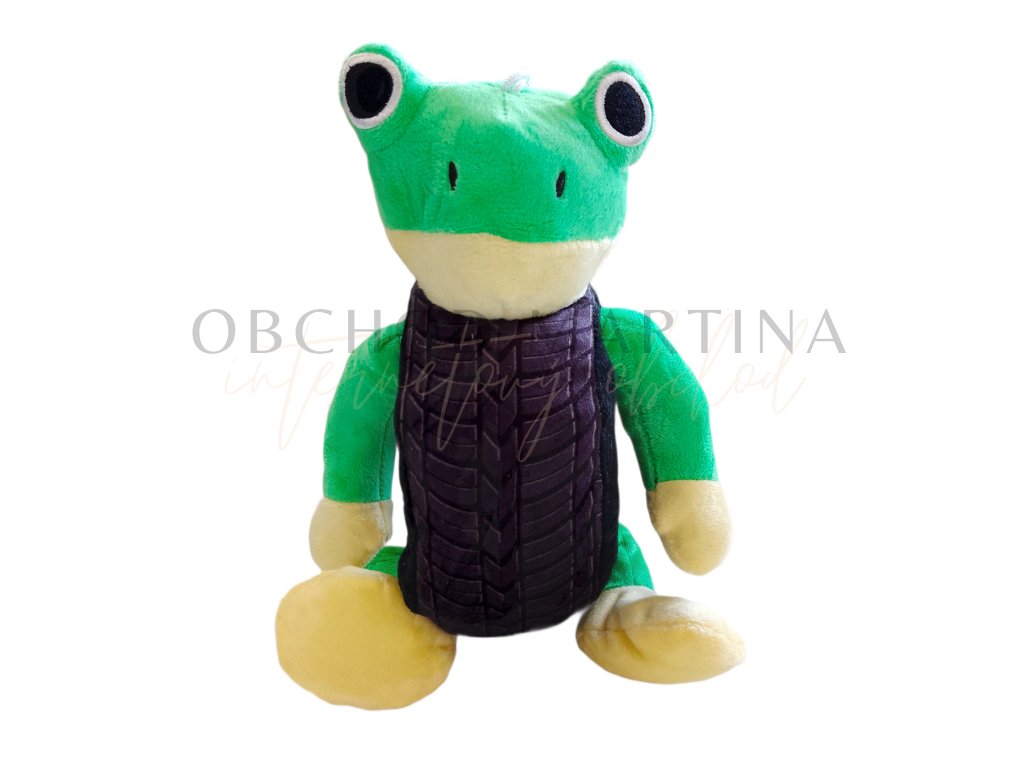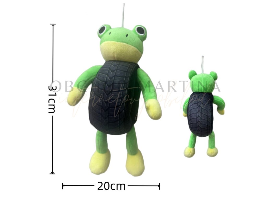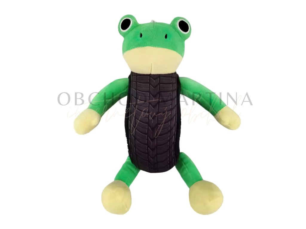 Tělo žáby je vyrobeno z měkkého plyše v zeleno-žlutém provedení, zatímco přední část tvoří realisticky vypadající černá pneumatika s jemně vystouplým vzorkem. Kombinace jemnosti a nečekaného prvku zajišťuje nejen vizuální kontrast, ale i hmatovou pestrost při hraní nebo mazlení. Je ideální jako plyšový společník i originální dekorace.