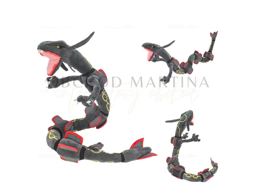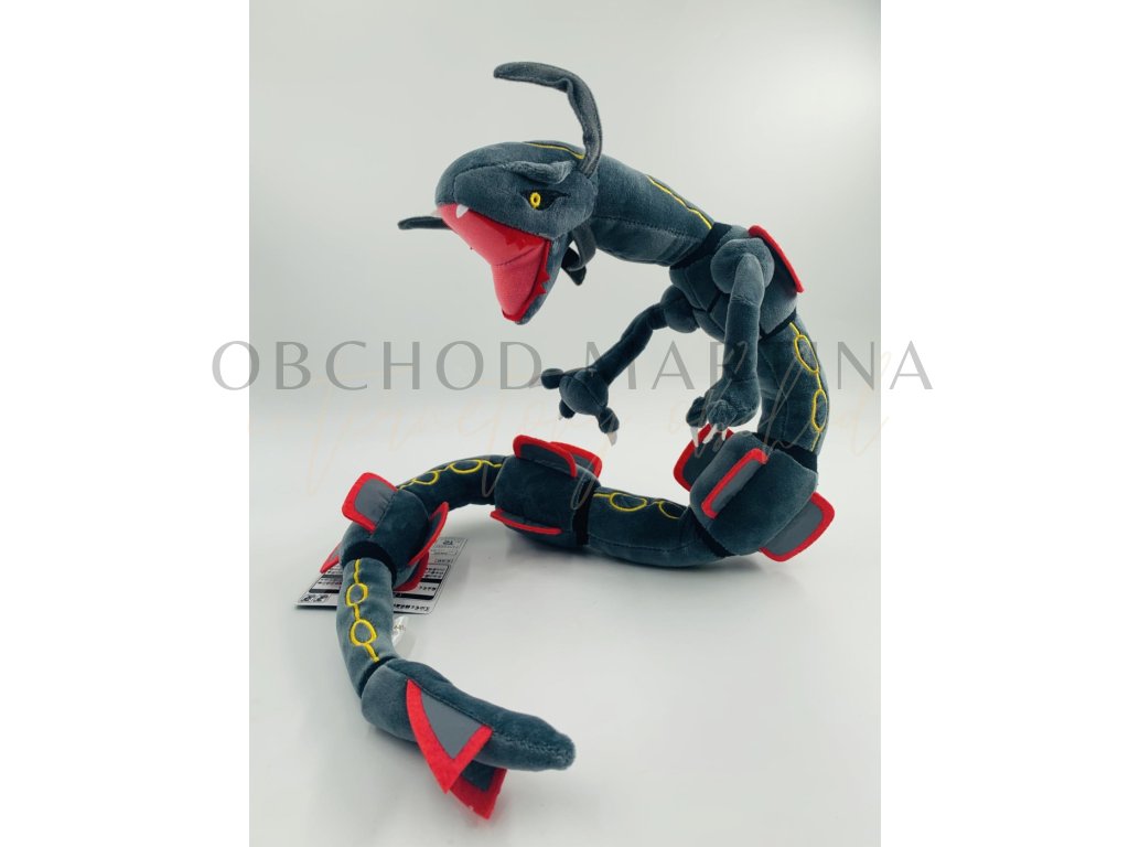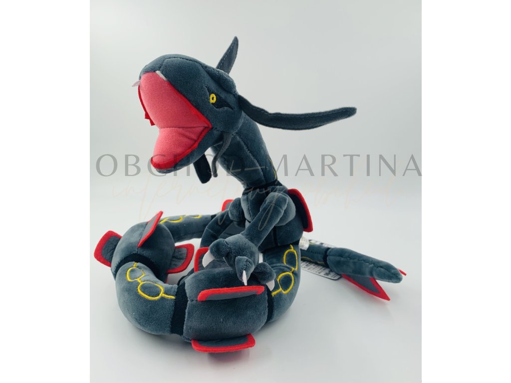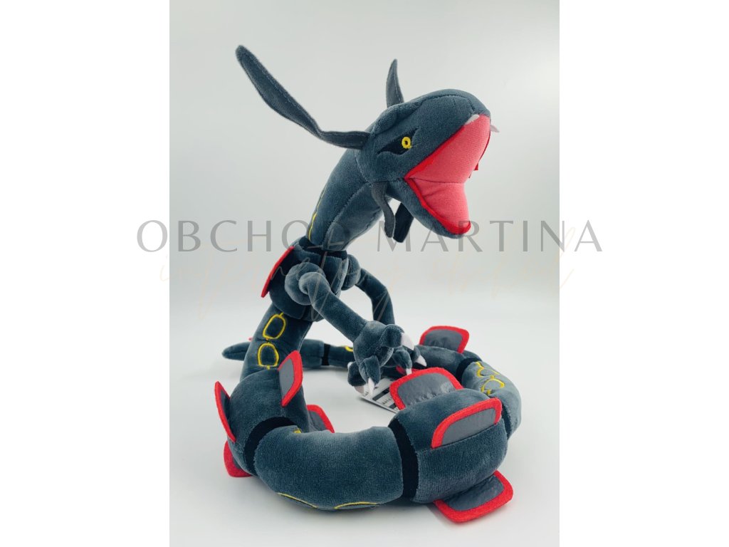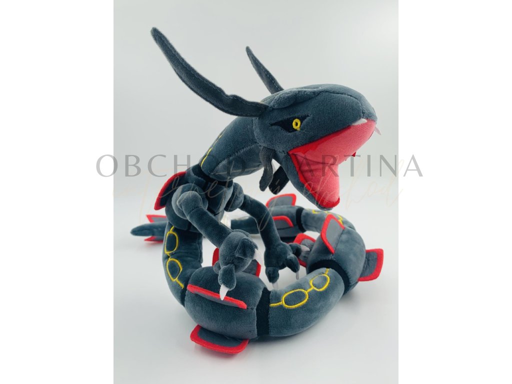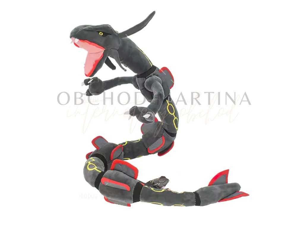 Plyšová hračka Pokémon Rayquaza šedý ohebný o délce 80 cm ztvárňuje legendárního Pokémona z nebes v jeho působivé černé variantě, známé jako Shiny forma.