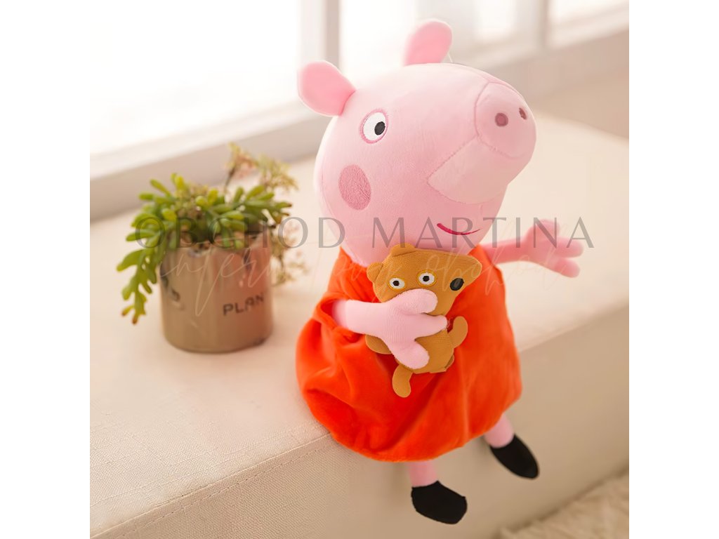 Peppa je zobrazena ve své klasické podobě – s růžovým čumáčkem, červenými šatičkami a oblíbeným plyšovým medvídkem Teddy, kterého si drží v náručí. Tato věrná podoba z ní dělá ideálního parťáka pro každodenní hry i večerní usínání.