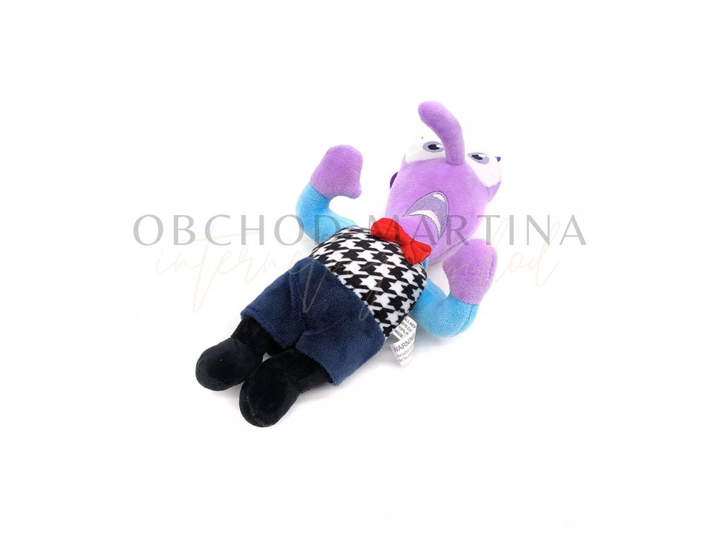 Hračka je vyrobena z příjemného a měkkého plyše, ideálního na mazlení. Má detailně propracovaný obličej, fialovou barvu pleti a výrazné oči plné obav. Je oblečený do stylové vesty s černobílým vzorem, modrého trička a červeného motýlku, což podtrhuje jeho filmový vzhled.