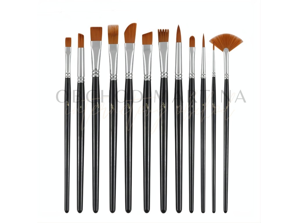 Sada 12 uměleckých štětců nabízí pestrý výběr tvarů a velikostí pro všechny vaše výtvarné potřeby, včetně nanášení barev na obličej a tělo.