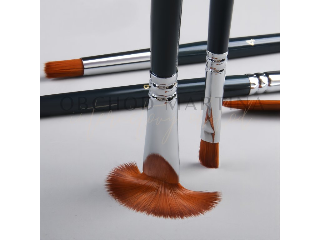 Štětce jsou vyrobeny ze syntetických vláken, která napodobují vlastnosti přírodního vlasu, ale zároveň poskytují vyšší odolnost a snadnější údržbu. Vlákna dobře drží tvar a rovnoměrně rozvádějí barvu, což zaručuje plynulý a konzistentní tah. Kovové objímky pevně drží štětiny a zajišťují dlouhou životnost každého štětce.