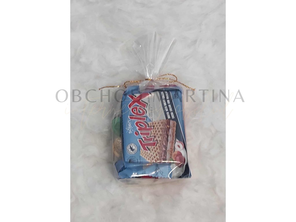 Balíček obsahuje oplatek Triplex, čokoládku Kit Kat, želé bonbóny HARIBO, čokoládová bankovka, 3 čokoládové kuličky.