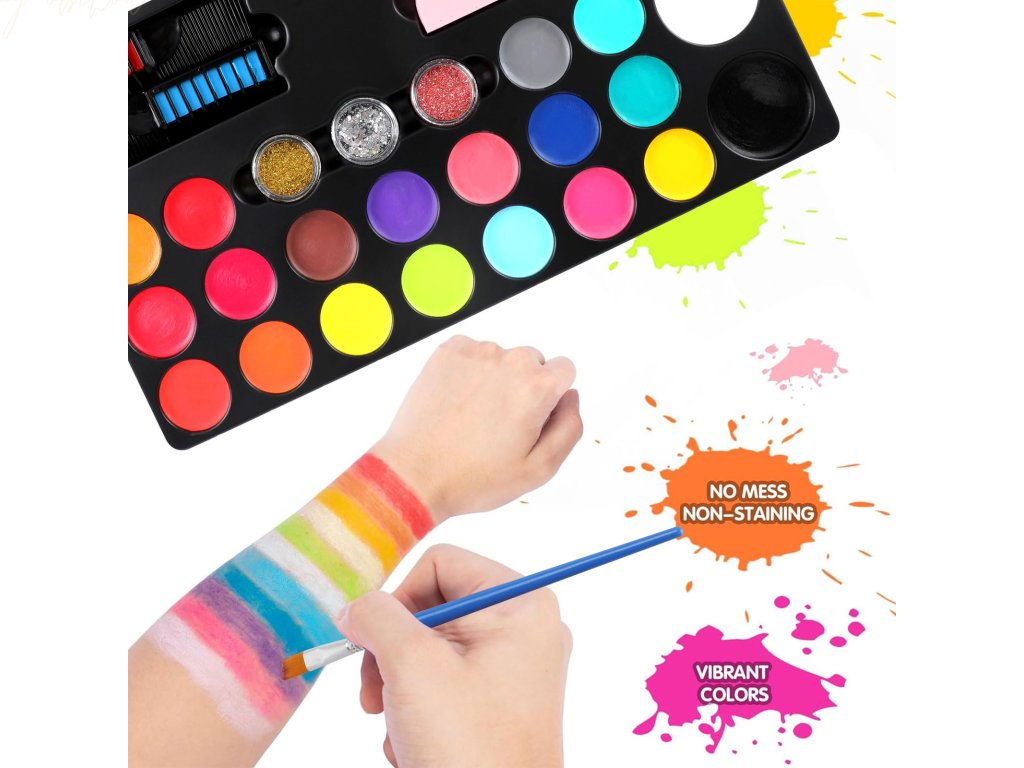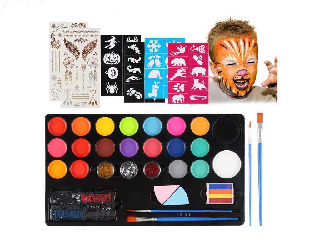 Luxusní sada barev na obličej a vlasy obsahuje vše, co potřebujete pro kreativní líčení na párty, karneval, Halloween nebo dětské oslavy.