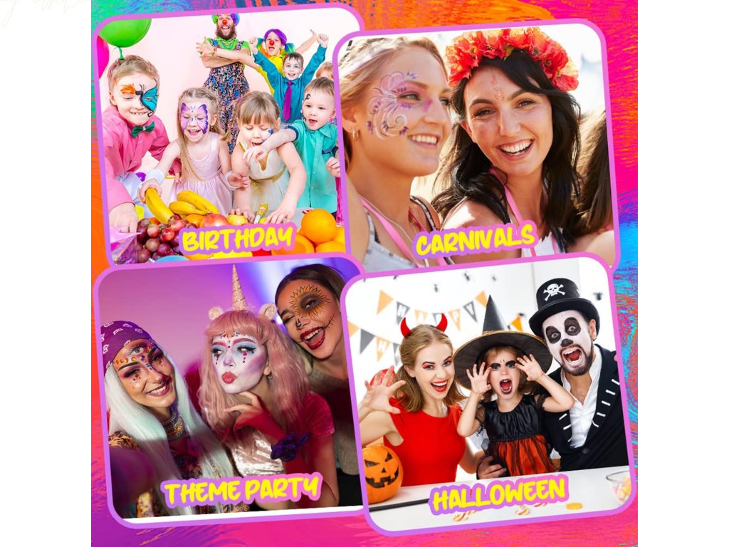 Barvy jsou vyrobeny z netoxických, hypoalergenních složek šetrných k pokožce, což zaručuje bezpečné použití i pro citlivou pleť. Snadno se nanášejí pomocí štětců nebo houbiček a dobře kryjí. Po skončení zábavy je jednoduše odstraníte vodou a jemným mýdlem, bez nutnosti používat agresivní čisticí prostředky.