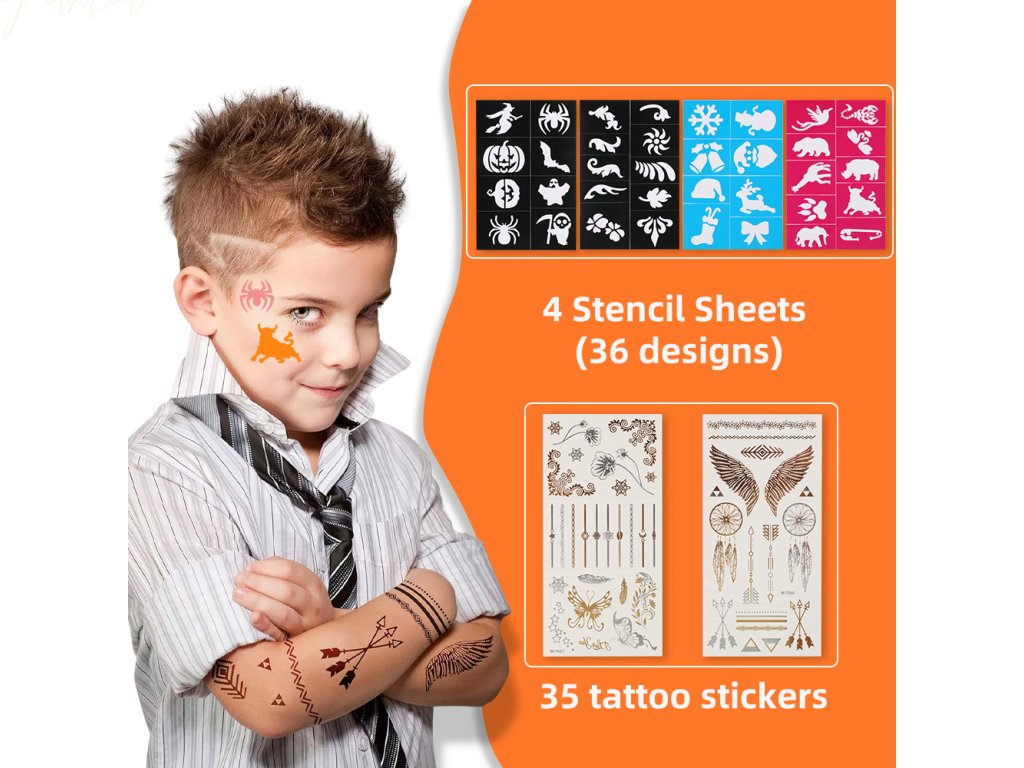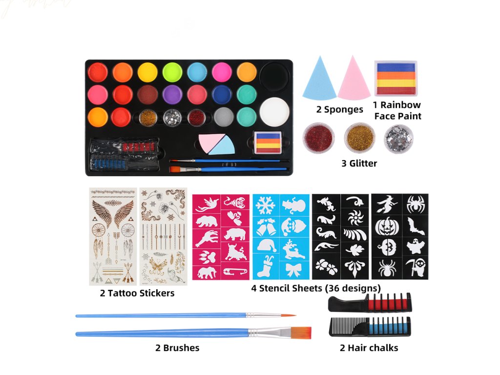 Součástí sady jsou také šablony s motivy zvířat, květin, fantasy postav a dalších tvarů, které usnadní tvorbu dokonalých maleb i začátečníkům. Třpytky dodají líčení slavnostní vzhled a křídy na vlasy umožní doplnit kostým o barevný účes.