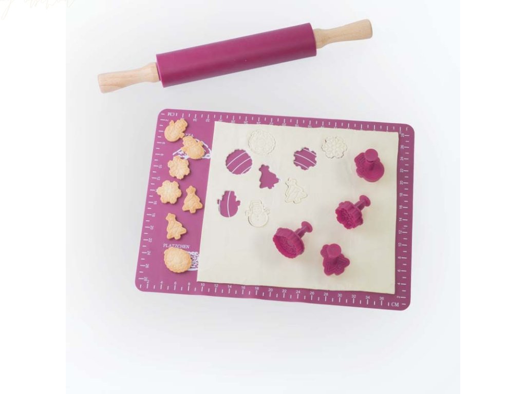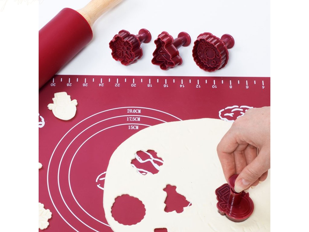 Sada formiček s razítky se 4 vánočními motivy (stromeček, sněhulák, sněhová vločka, věnec) pro přípravu domácích vánočních dobrot.